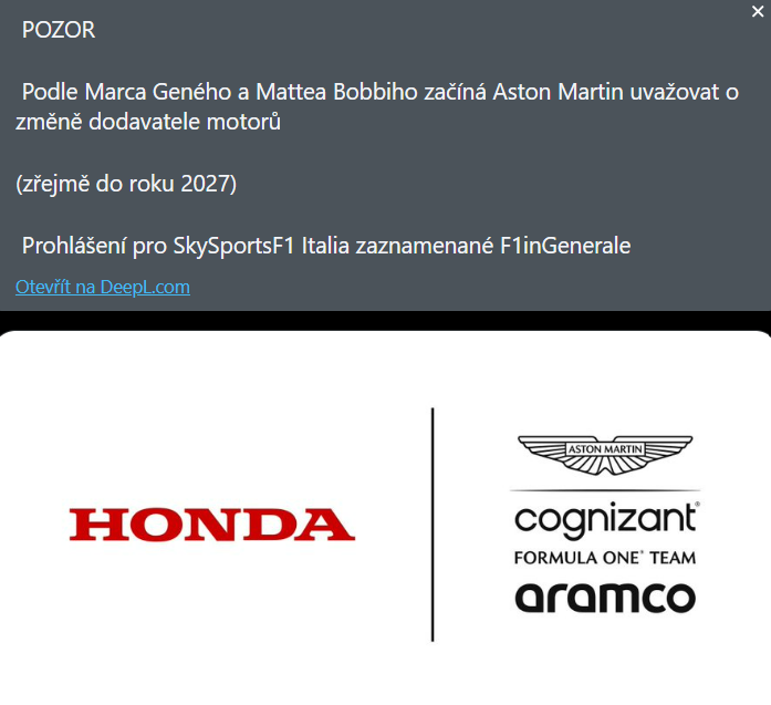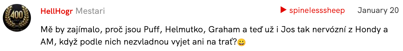 Adrian se s Hondou nemaže, a od začátku do nich teda pěkně šije. Nevím zda je to dobrá či špatná cesta, ale je to teda pěkně v perdeli. Buď ať Hondu vykopnou, nebo to začne brát Honda seriózně, Aston si nemůže dovolit být na samém chvostu moc dlouho. Stroll starej mlčí, zestárnul tak o 20 let, musí to být hrozný co teď s tím.