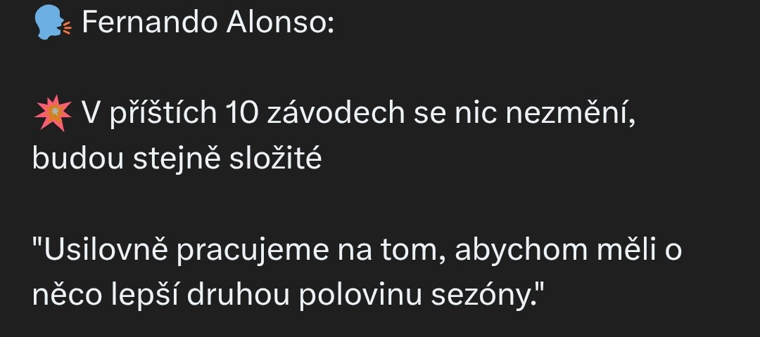 no bojím sa že tento rok absolutne zlepšenie nepríde.. Fernando rozprával že v Bahraine uvidíme skutočný monopost.. teda teraz v Miami, no predlžuje sa to a predlžuje.. tých problémov tam musí byť strašne vela, som velmi prekvapený že Fernando to takto obhajuje, na jeho mieste už by som dávno kričal GP2.. mám pocit že postupne sa to zlepšovanie predlži a predlži a tento rok nejaký významný pokrok ani neuvidíme, predsa netreba zabúdať že aj konkurencia zrýchluje.