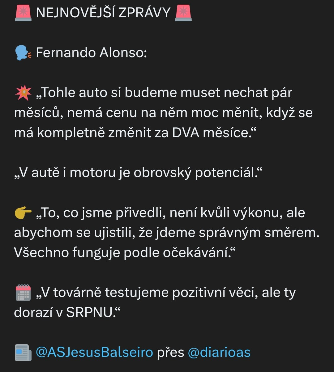 Tak Bahrajn a Saudská se zrušili a další závod bude Miami, ale dneska potvrdil, že reálná změna přijde v srpnu po letní pauze a dalších 10 závodů bude jako teď. Honda navíc snížila ještě víc otáčky motorů, aby dojeli závod doma
