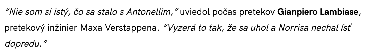 Ono tym, ze ten zaber Kimiho chyby dali do prenosu dost neskoro, tak si vsetci mysleli, ze ho pustil, lebo to tak vyzeralo. V live prenose nebolo vidiet ten Kimiho smyk, ale len sirsi vyjazd zo zakruty, ked ho Lando predbiehal, a presne to GP povedal Maxovi.