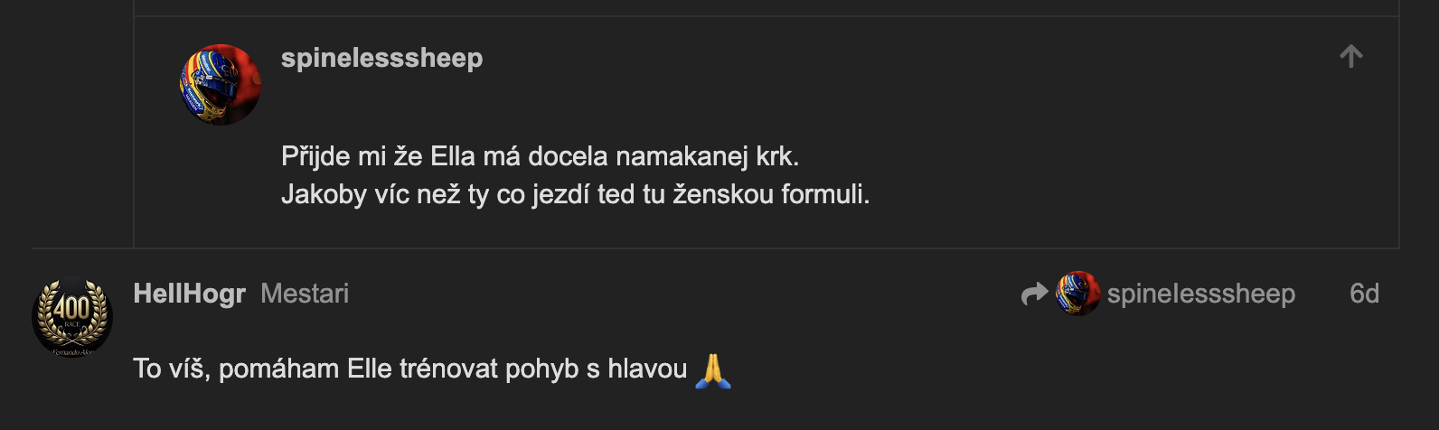 A ne, nejsem osobni. Prijdes mi cas od casu fajn a nechci, aby te neco trapilo. Porad jsme na forum o tymech, lidech a jezdcich, kteri ani netusi o nasi existenci. Byl bych teda nerad, kdyby te neco trapilo.