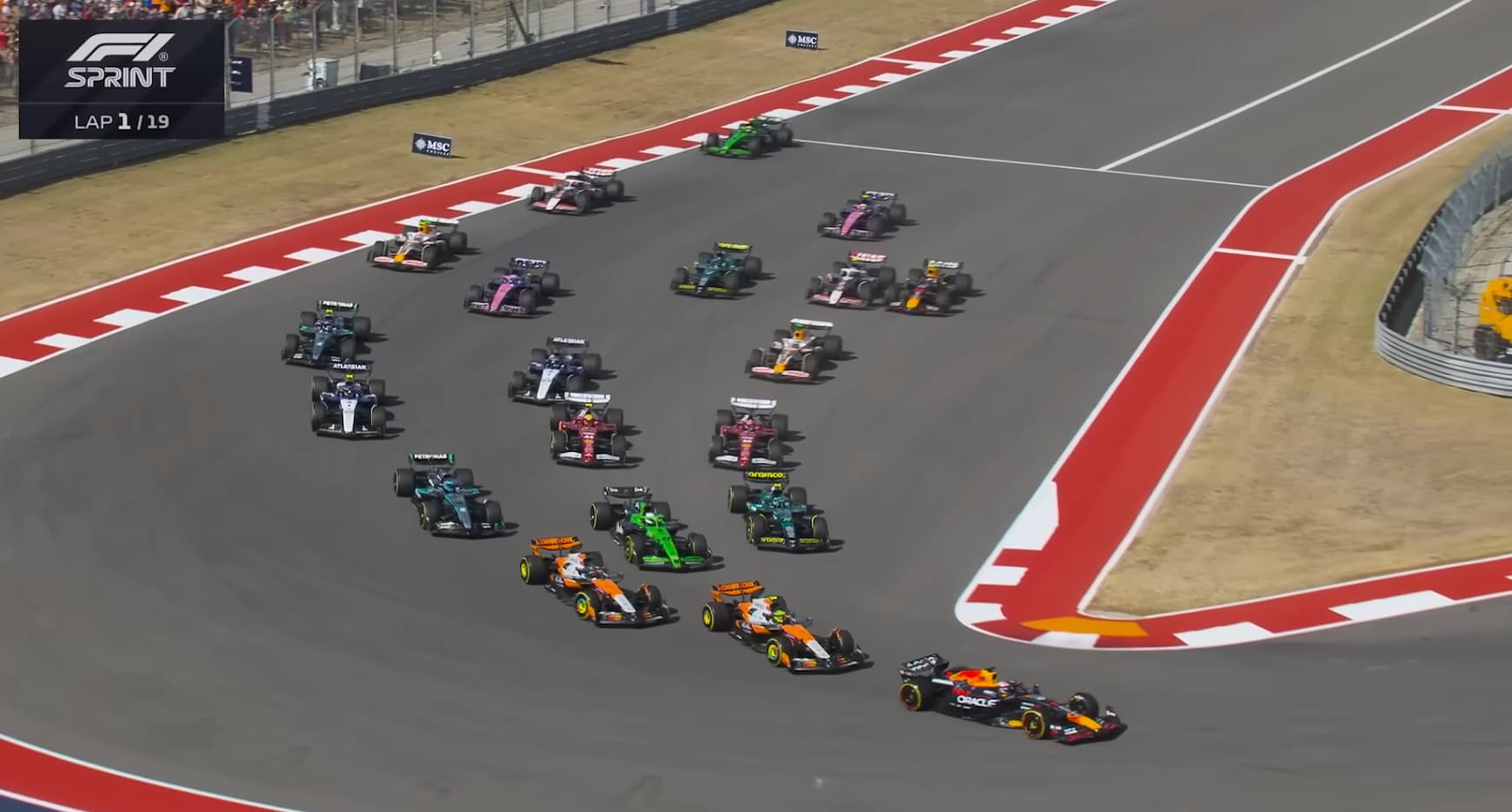 Verstappen - Norris - Hulk - Hamilton. Všetci v jednej stope a všetci nechávajú dosť miesta na vnútrajšku. Oscar si zvolil vonkajšok, rovnako ako Russell a ostatní za nimi, ale nikto okrem Oscara nespravil takéto kamikadze prekríženie, lebo vedeli, že sú tam aj ďalšie autá.