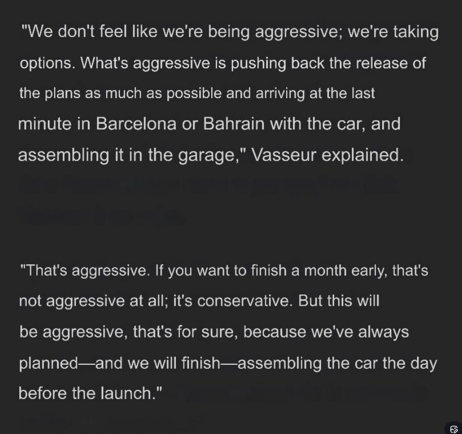 Tak ITA médiá a Autoracer to začínajú dávať zožrať to embargo Vasseurovi. Možno sa tu objaví článok podľa, ktorého ešte Ferrari neurobilo Fireup motoru na 2026, ale reálny dôvod má byť, že sa to snažia maximálne natiahnuť až do posledného momentu, než auto vyjde na trať aby vyvíjali agresívne.