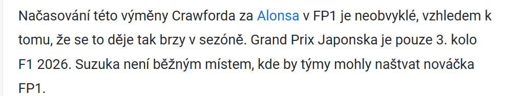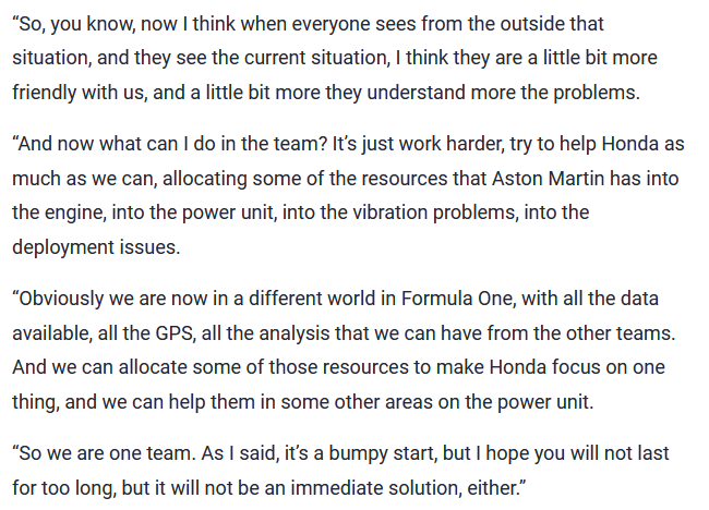 Crowford není nezkušený nováček a za AM už nastoupil v trnelanch, tohle nasazování vyžaduje FIA skrze pravidla. Je to maximálně přání otce myšlenky. Jinak co Alonso nezměnil? Však Alonso nekomentuje Hondu, říká, že ten motor je takový jaký je, o nervovém poškození mluvil Newey, ne Alonso