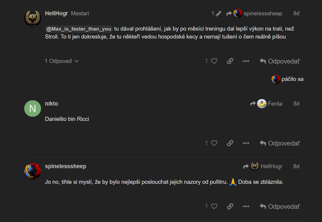 Jednomu nadavaji za to, ze rekne, ze by po mesici treninku porazil $trolla. Druhy napise, ze by vykon jako Verstappen zajel i on a oni mu pritakavaji.