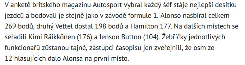 Opat ohnutie, len aby ti to sedelo na Alonsa. Nikto 2x tak tesne neprehral titul, takze to bude jeden z dovodov.