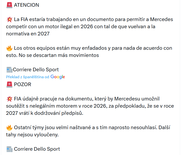 Podle německého portálu. A jak na to Ferrari, Honda a Audi přišli? No víš jak ne? Ne? no tak, že to vypustil bývalí zaměstnanec Mercedesu (nyní u RBPT) do éteru.