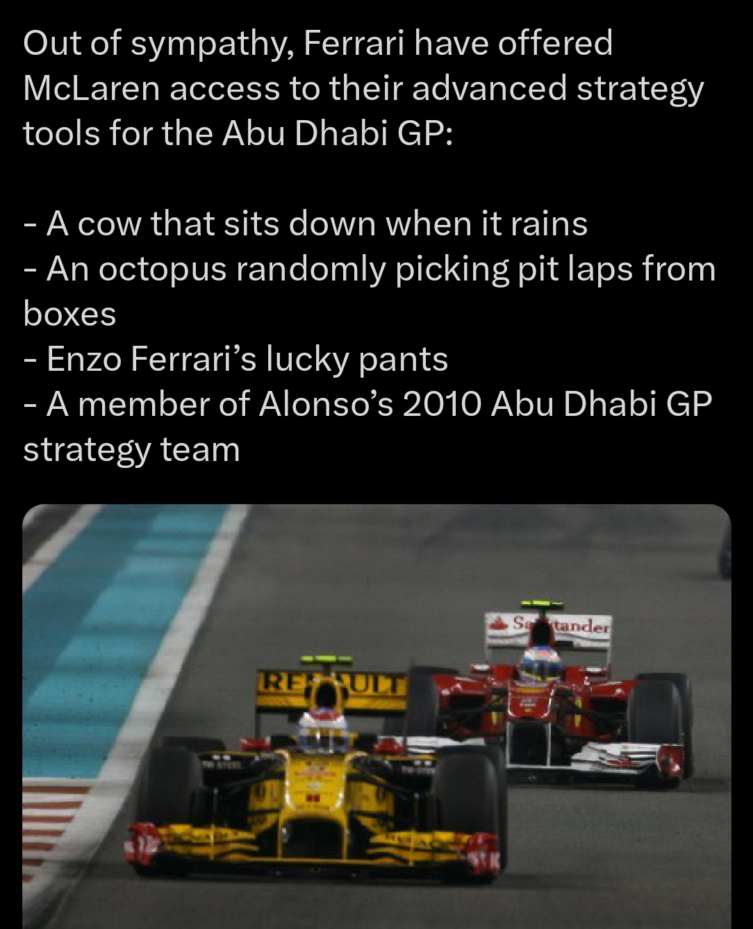 Především Seb vůbec nepotřeboval, aby ho Schumi pouštěl, na titul mu stačilo dojet sedmý za Michaelem. Vyhrál by o bod, takhle vyhrál o tři, rozdíl mezi 6. a 7. místem byly (a jsou) dva body. Ne, nevím, proč Newey píše ve svojí knize, že se báli, že ho Schumi nepustí, když to přitom vůbec nepotřeboval. Možná proto, že byl rozjetý a chtěl by dopředu stejně, tak kvůli riziku kolize (?), ale čistě matematicky to význam nemělo.