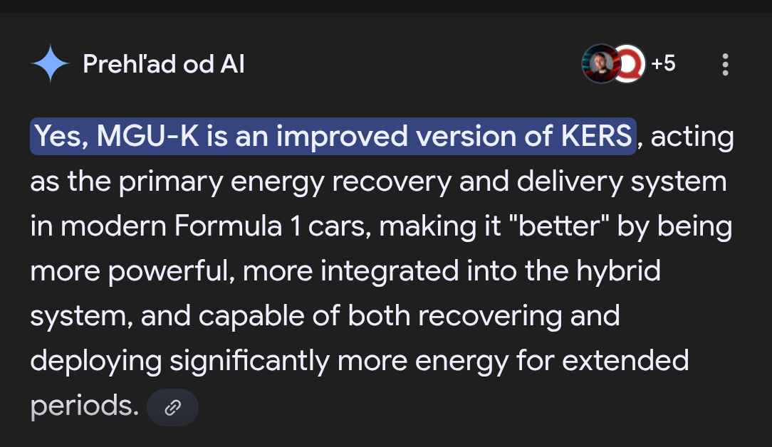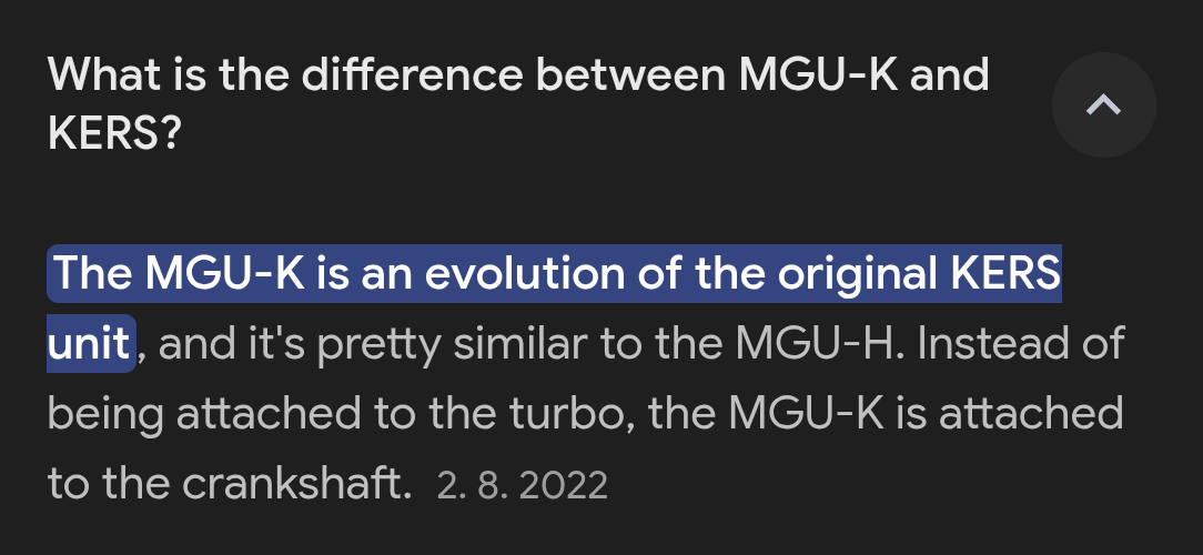 Však MGU-K je evolúcia a vylepšenie KERS, tak v čom nemáme pravdu? Zbiera to kinetickú energiu efektívnejšie ako KERS. Ale princíp je istý.
