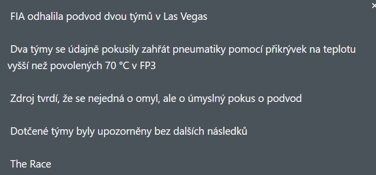 V zásadě Norris potvrzuje tah na branku a rozhodnutí jít tvrdě po titulu. Sice s chybou, ale přesto, s pole position pokračuje v linii výsledků, jaké potřebuje. Piastri aktuálně se smůlou, ale ani bez ní by nebylo jisté, že bude rychlejší než Norris. Sportovně mu podržme palce, ačkoli titul s největší pravděpodobností nevybojuje, bylo by dobré a pěkné, kdyby si zvedl sebevědomí dobrými výkony v zbývajících závodech. Bylo by to dobré i pro jeho jezdeckou důstojnost a vyhlídky na příští sezónu. Max podle mě potvrdil reálné možnosti Red Bullu, McLaren je v této sezóně auto číslo jedna, s druhým místem za mě jako fanouška spokojenost. Vysloveným překvapením je pro mě Sainz, na vodě nikdy nebyl dobrý, chyboval na ní i ve Williamsu, tady se to sešlo a vyšlo mu to, gratulace.
