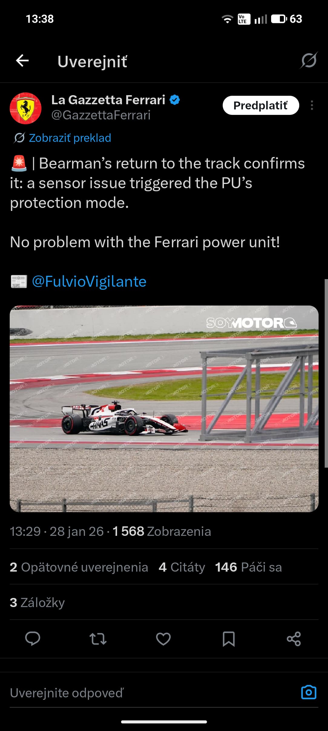 @forzaferrari1 Ferrari PU vpohode. Haas mal ráno chybný senzor ktorý aktivoval protekčný mód pohonnrj jednotky aby ju ochránil.