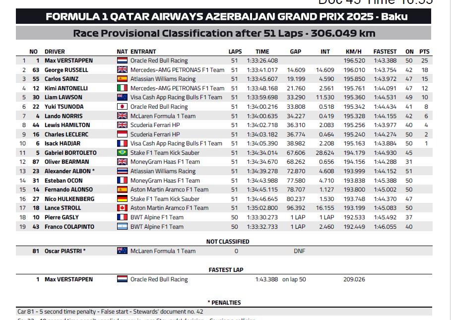 Verstappen gratulácia, Mercedes a najmä Sainz s Lawsonom ale aj Cunodom prekvapili, Mclaren negatívne. Hamilton po veľmi dlhej dobe s podobným tempm ako Leclerc. Bolo by super, keby sa o titule rozhodovalo medzi týmito prvými tromi v cekovom poradí v poslednom závode.