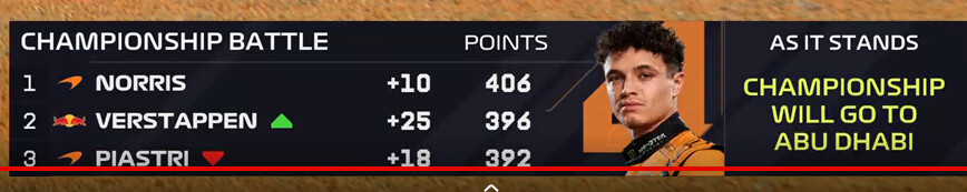 Ono na konci dna netreba byt nenasytny…uz len to, ze Max si ide po vyhru v pretekoch, kde to malo byt jasne double Mclarenu, je obrovsky uspech a ovela viac, nez v co mohol dufat. Aj keby to zrovna mal Norris vytiahnut na P3, Max opat ziska (ak sa nic zasadne nestane) body tam, kde mal nejake stratit.