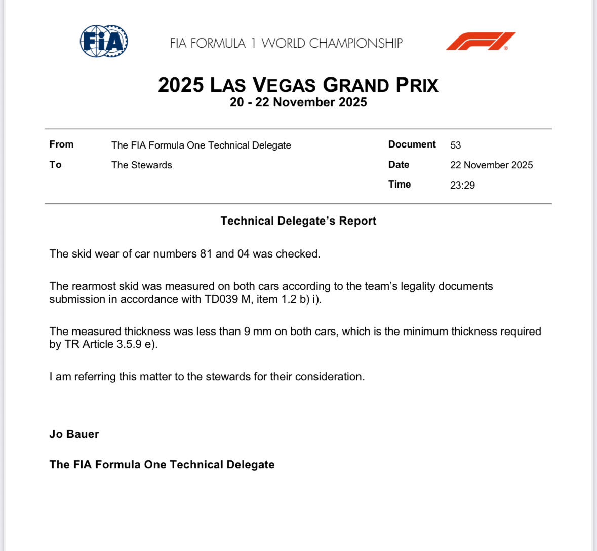 AKTUÁLNÍ ZPRÁVA: Oba vozy McLaren byly předány komisařům kvůli problémům s opotřebením podlahy #F1 #LasVegasGP