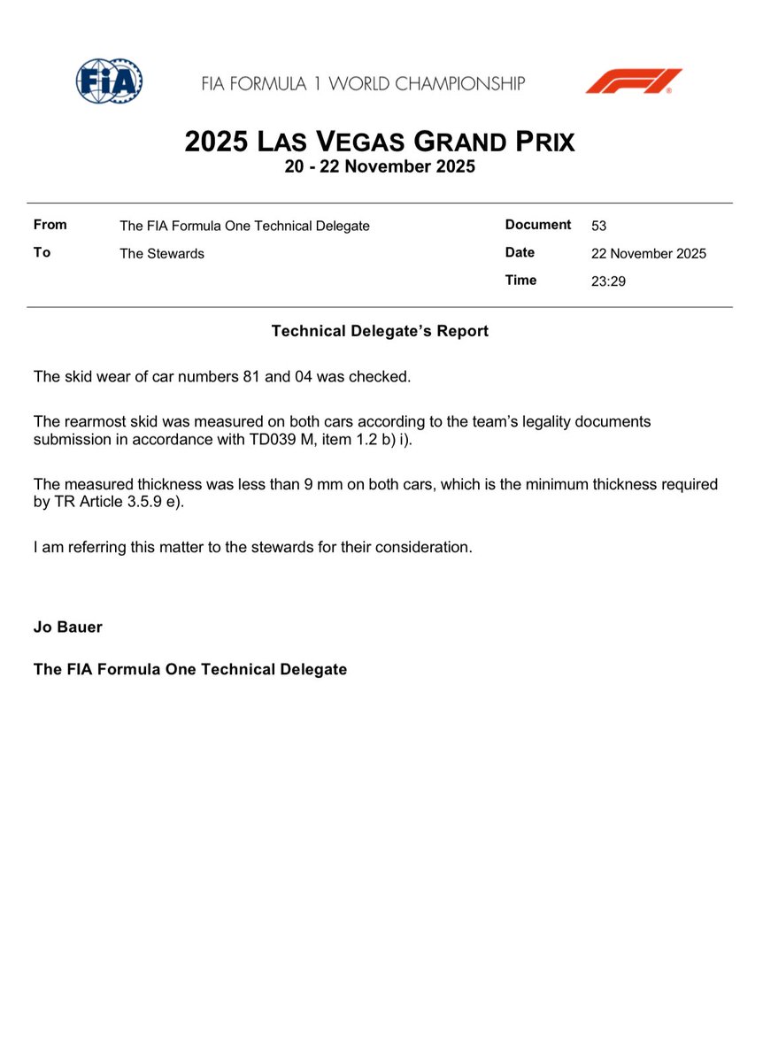 Však je to plank. Už vydali ofiko dokument pre komisárov. Oni iba musia potvrdiť DSQ obidvoch McL. Len LICO bolo u Norrisa asi kvôli palivu a zistili aj Plank, tak si vybrali ešte Piastriho ku kontrole. Len aj v Číne obidve Ferrari kontrolovali vonku a McL z nejakého neznámeho dôvodu zatiahli do garáže a schovali pred ľuďmi