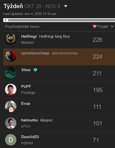 Odpocitaj tie default lajky v ramci vasej buzerantskej trojky a vyjde ti, ze ste uplne na dne fora.