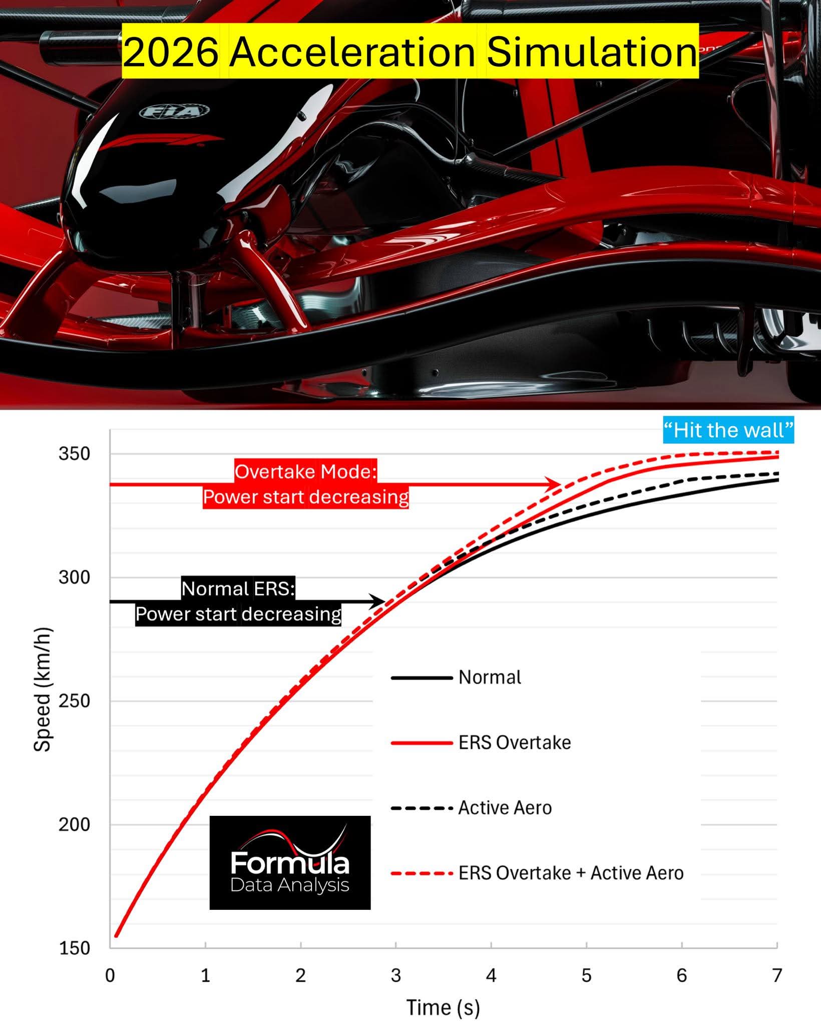 full ERS power is available. With overtake mode and open wings, '26 cars will accelerate super-quickly until 337.5km/h, then effectively ‘hit a wall’ (as ERS power drops sharply)