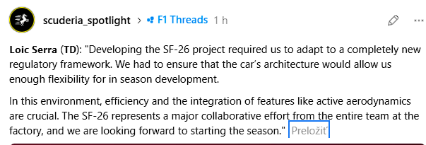 Tak Fred hovoril, že finálnu verziu AERA nasadia až na Bahrain posledný deň testov. Akože už teraz je to dosť premakané a nejaké analýzy sú, že dosť extrémne prepracované aero. Som zvedavý aké to bude na trati.