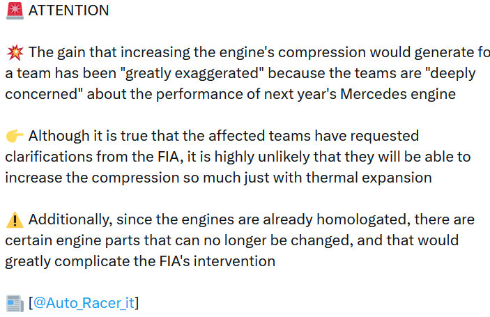 „Předpis jasně definuje maximální kompresní poměr a také metodu jeho měření, a to na základě statických podmínek při pokojové teplotě,“ oznámila Mezinárodní federace. „Tento postup zůstal nezměněn i přes snížení povoleného poměru pro sezónu 2026. Je pravda, že tepelná roztažnost může ovlivnit rozměry, ale současné předpisy neumožňují měření při vysokých teplotách.“