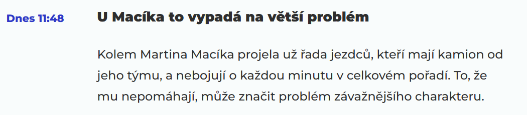 Taky mi to připadalo, i když asi se to dá pochopit. Přece jenom, Macík už má dvě vítězství, Loprais pořád čeká, měl i velkou smůlu v r. 2023, roky přibývají… Jasně, tohle byla smůla a je to taky součást závodů, i předtím měl už ztrátu, no ale asi to snáší hůř.