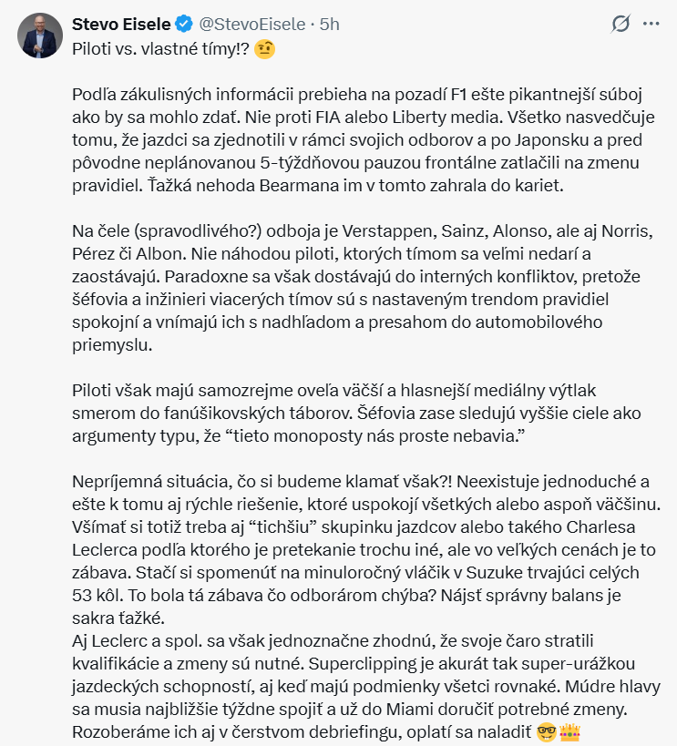 situacia sa minimalne do buducej sezony zmeni. Je tam viacero parametrov, s ktorymi sa mozu hrat a aj sa budu, tak aby jazdci aj divaci boli spokojni. Nie je sa coho obavat.