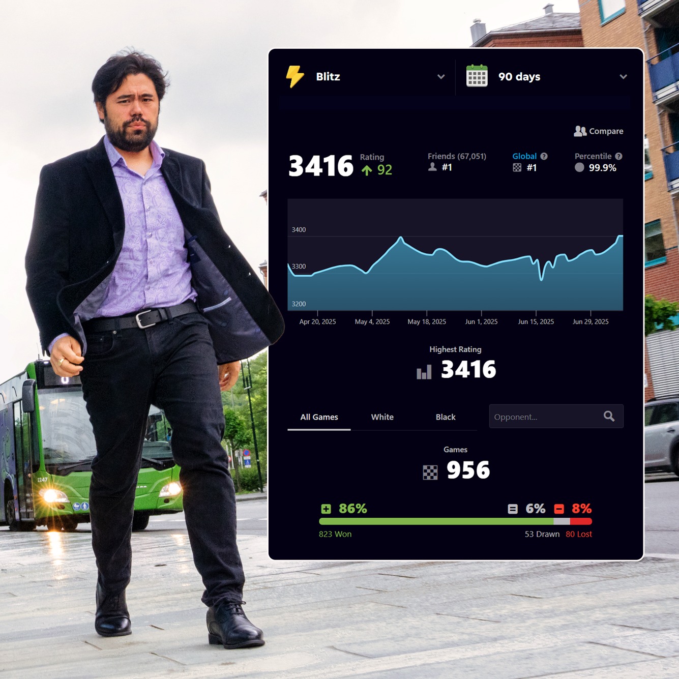 During his Titled Tuesday victory, Hikaru Nakamura reached a staggering 3416 Blitz rating - a site record!