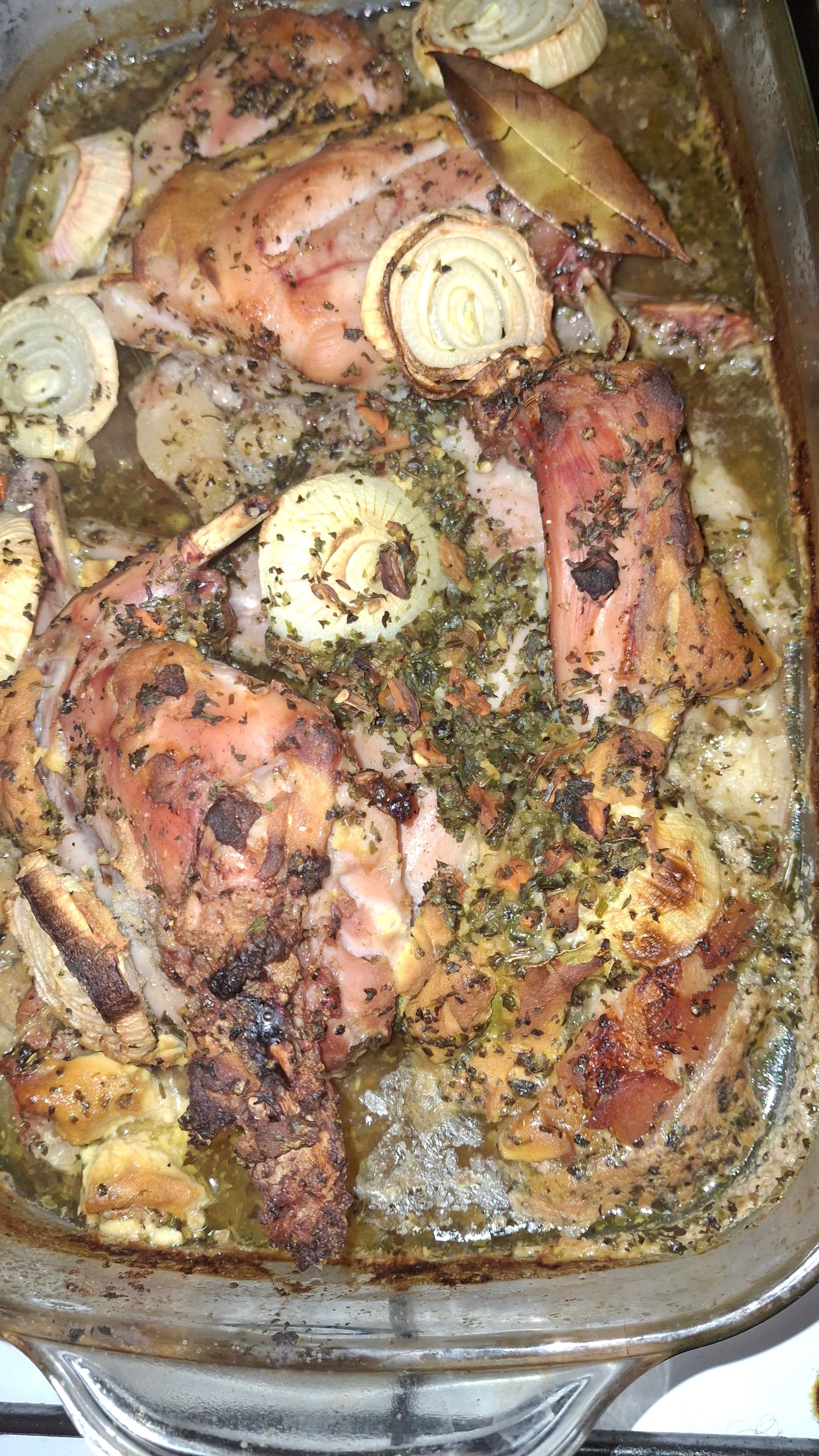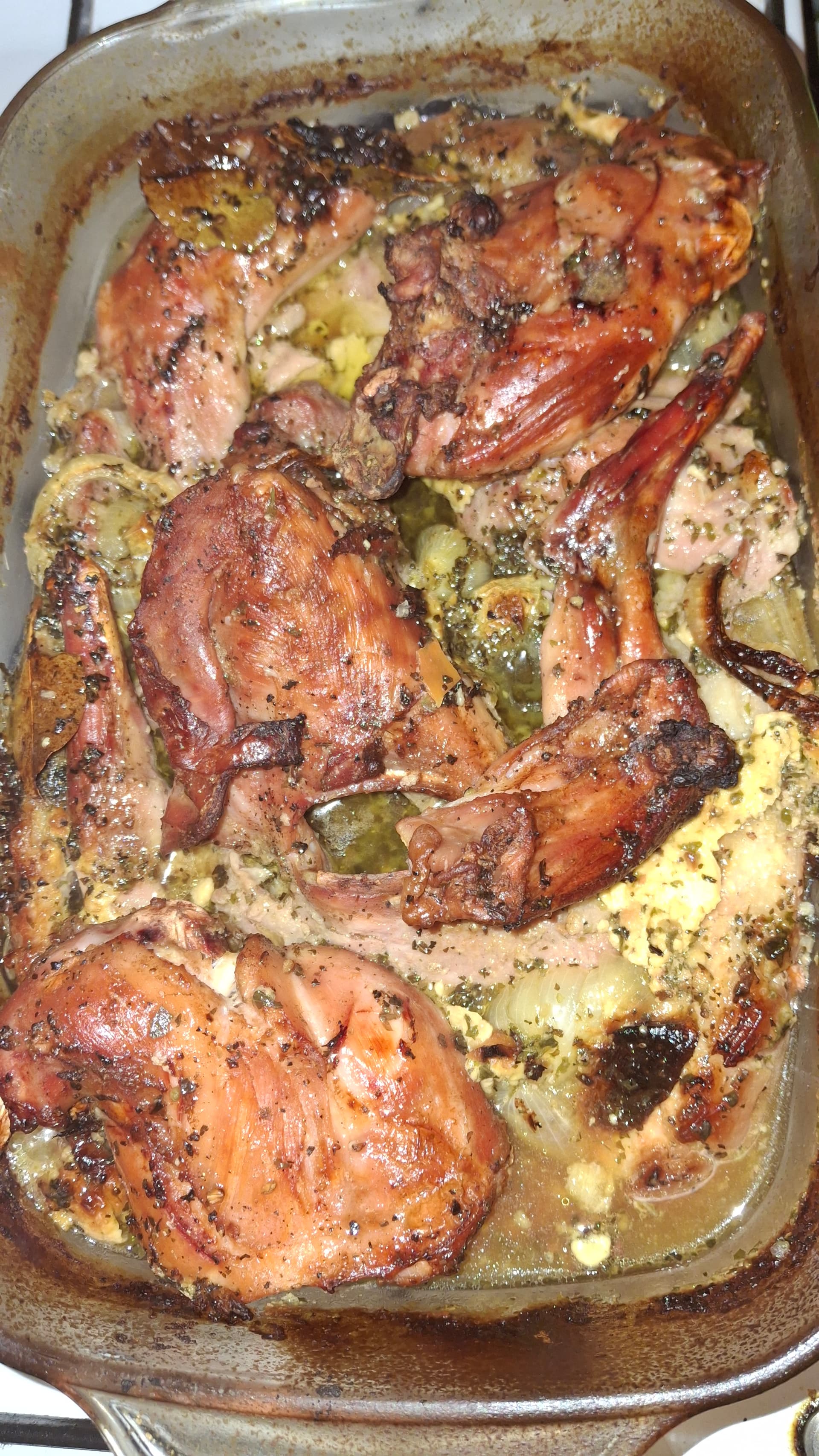 Já vlastní recept nemám. Nakouknu na internet pro základní informace a protože moc nesolím, tak dávám větší důraz na kořenící bylinky. Místo Magi nasypu trochu více libečku a majoránky. Hlavní důraz dávám na kvalitní suroviny a nesnažím se pečení urychlit. Tentokrát jsem boky pekáče obložil asi dvoucentimetrovým bůčkem, tak jsem zvědavý na výsledek až ho ochutnám. Včera jsem se totiž s ochutnávkou zaměřil pouze na králíčí stehýnka.
