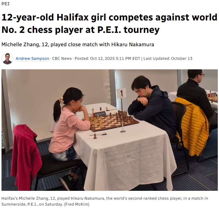 “Maybe he, like, underestimated me a little bit,” said Zhang, 12, after holding Nakamura at bay for 65 moves in a first-round match at the Maritime Open Chess Championship in Summerside, P.E.I.