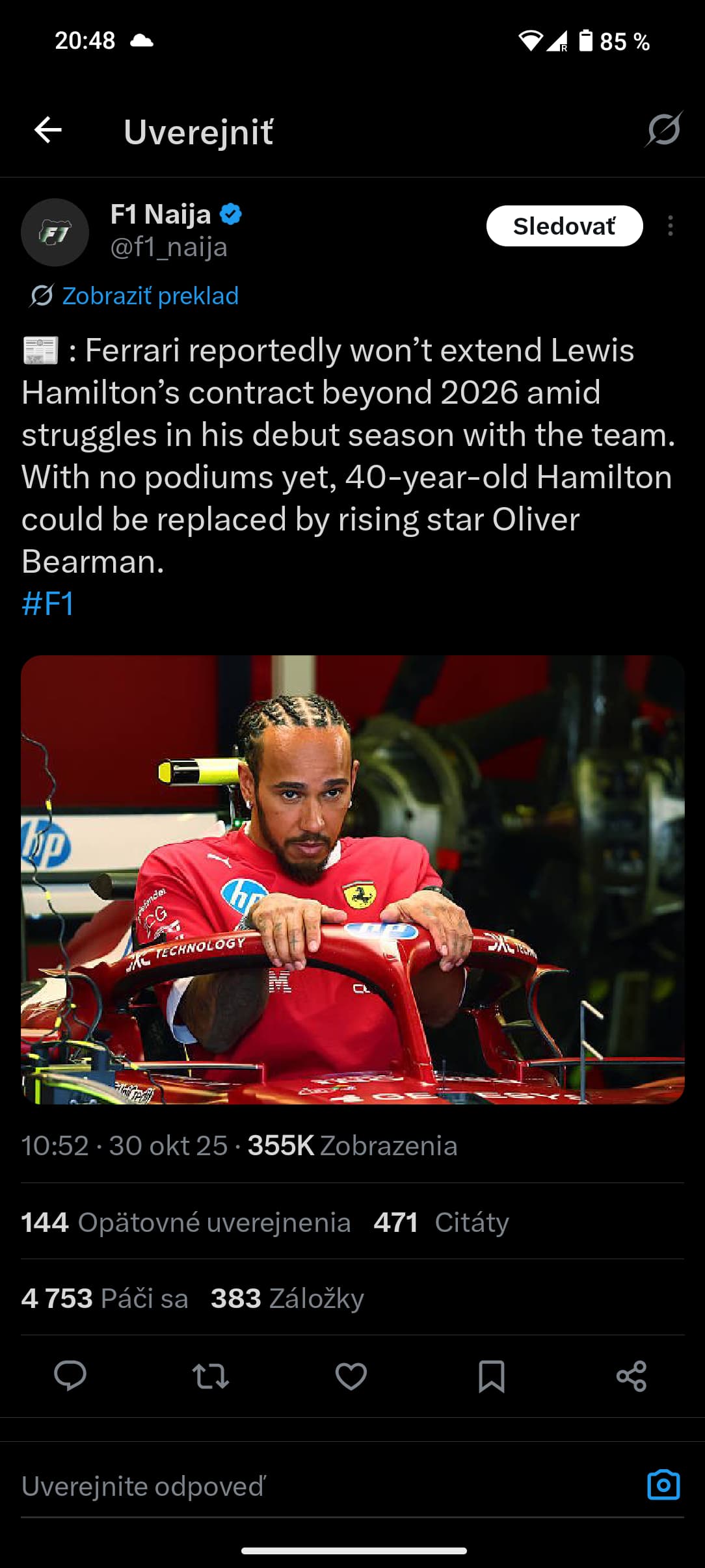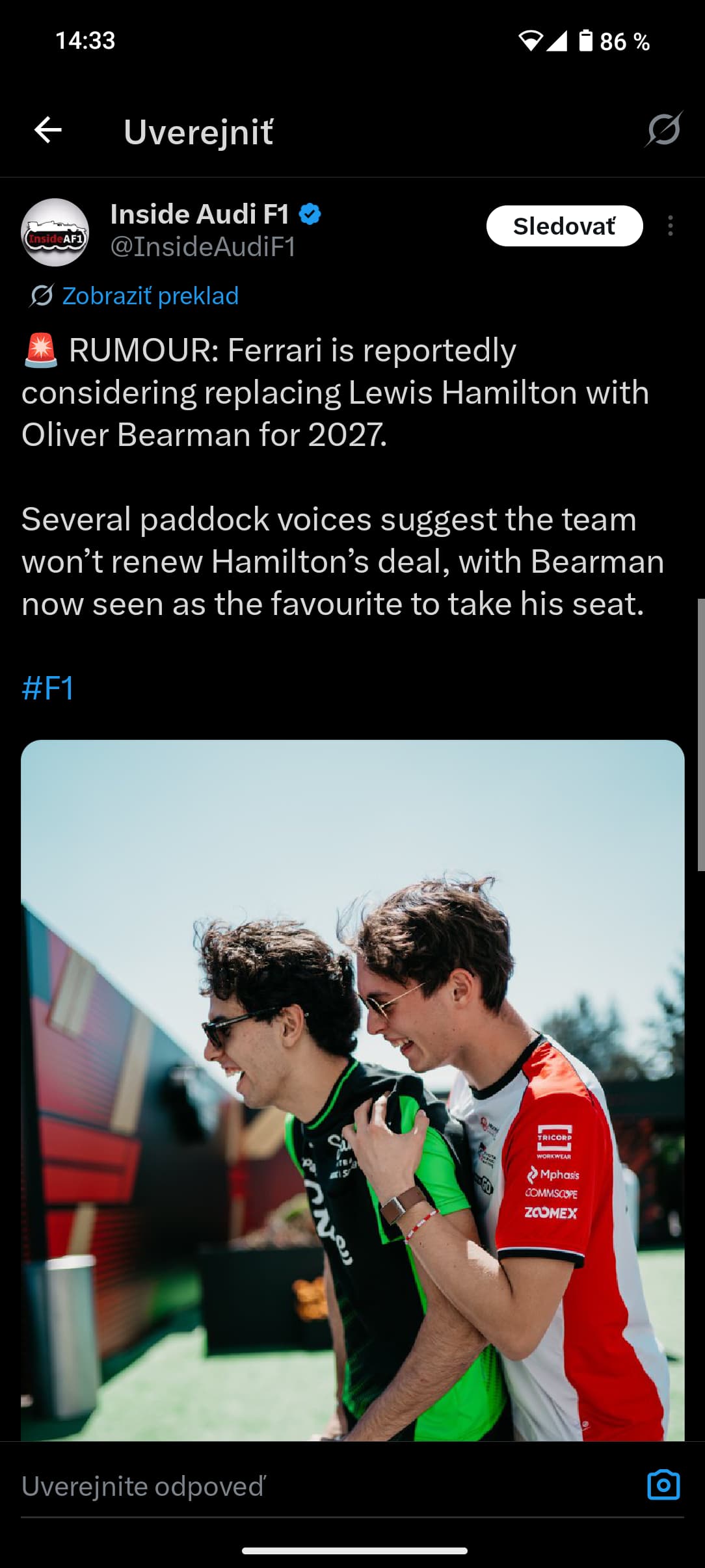Lewis ve Ferrari byt nechce, urcite uz ma nekde domluveny prestup, chce titul ten tym neni schopny dorucit mistrovske auto. Russell se pochlubil ze ma jen 1+1, Kimi nebude mit na vice let. Budto tam pujde Bearman, tomu bych i veril nebo Kimi jako Ital.