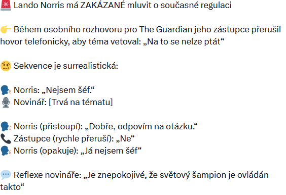 Je smutné, do čoho sa zamotali pôvodne ekologické motívy tejto zmeny - marketingových 50:50, kde tých druhých 50 je nakoniec tiež viac z benzínu než z rekuperácie, umelá šou s obiehaním, nemožnosť pilotov tlačiť na pílu, nebezpečné štarty, na každej rovinke iný výkon daný stavom batérie, rozhodnutím nejakého AI bota a teraz už aj pravidlami. A toto všetko budeme všetci trpieť minimálne 4 roky, pre istotu poistené (takmer) zákazom vývoja ešte pred prvými pretekmi.