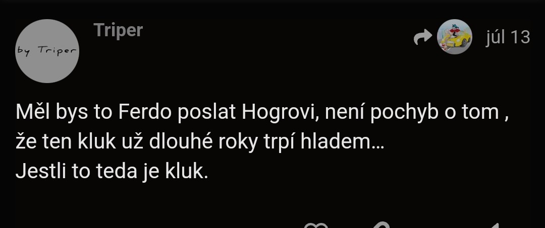 Tak Jirka si tu založil druhej účet, kde psal, jak máme exekuce a ještě tu z lidí tahal peníze, že za 300kč jim to údajně ukáže. Takovej je to formát, hlavně, že dva morální majáci fora tu Jirkovi lajkujou všechny blbosti bez toho, aniž by se alespoň trochu zamysleli. Jirka je prostě šmejd, co místo hrnců prodává svoje vymyšlený příběhy a ještě je tak blbej, že se v jednom příspěvku odstřelí 2x minimálně