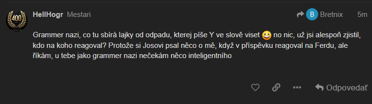 On uz nemuze byt horsi… Misto grammAr napise grammEr a me/mne | si/jsi mu taky nic nerika. Ten je jasnej. Ale miluju to, jak pak nekoho poucuje o pravopisu. Jeho chabr spin je nemlich stejny zviratko.