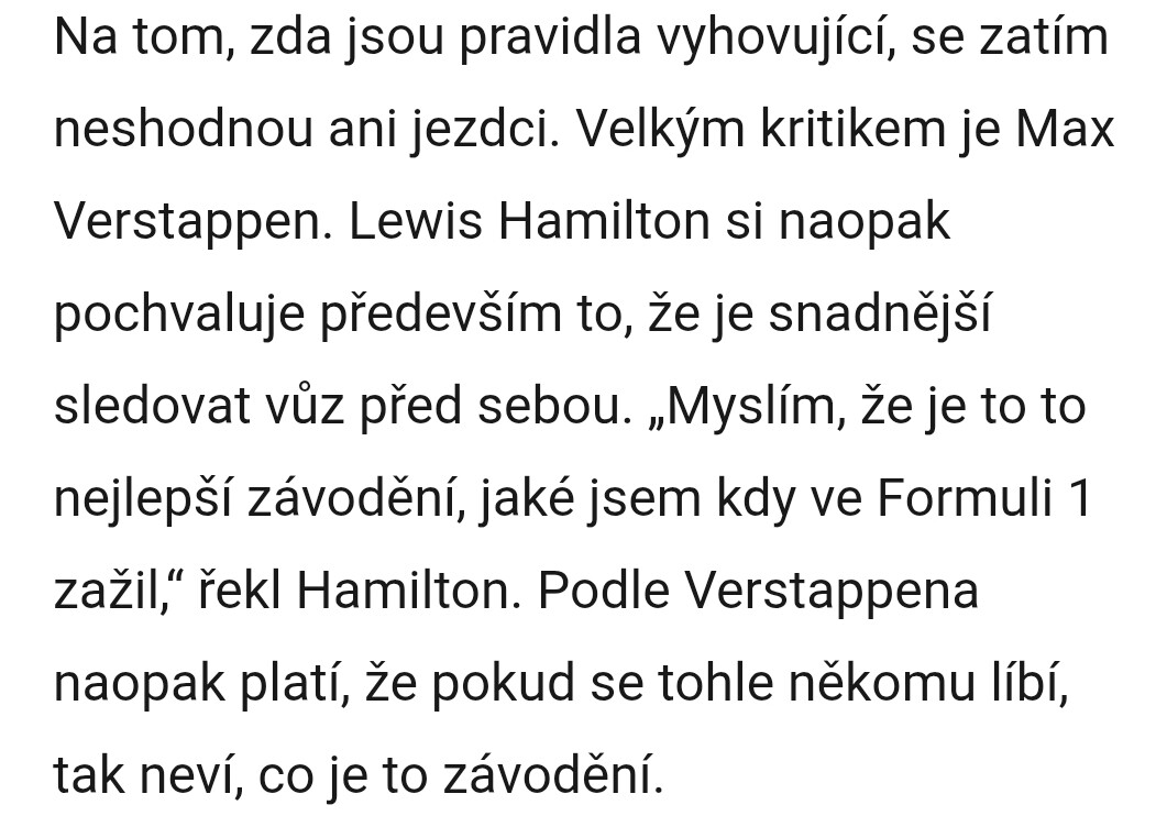 Hamiltonuv názor má v tomhle 100x větší váhu. Ten má aspoň zkušenosti i s něčím jiným. Verstappen je kozel zahradníkem.
