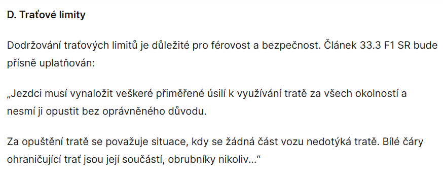 No a pak jsou tam vyjmenované ty výjimky, kdy se ani výjezd všemi čtyřmi mimo trať za opuštění tratě nepovažuje, to už sem znova kopírovat nebudu.