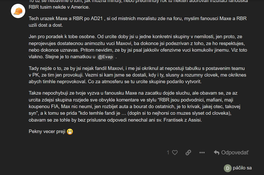 Takze nepochybuji ze tvoje vyzva u fanousku Maxe na zacatku dojde sluchu, ale obavam se, ze az urcita zdejsi skupina rozjede sve obvykle komentare ve stylu “RBR jsou podvodnici, mafiani, maji koupenou FIA, Max nic neumi, jen rozbijet auta a bourat do ostatnich, je to krivak, jakej otec, takovej syn”, a k tomu se prida "kdo temhle fandi je … (dopln si to nejhorsi co muzes slyset od cloveka), obavam se ze tohle by bez prislusne odpovedi nenechal ani sv. Frantisek z Assisi.