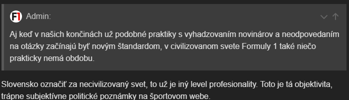 “Aj keď v našich končinách už podobné praktiky s vyhadzovaním novinárov a neodpovedaním na otázky začínajú byť novým štandardom, v civilizovanom svete Formuly 1 také niečo prakticky nemá obdobu.“ - ale tak nájde si to tu, v menej civilizovanom svete, svojich “kritických fanúšikov”, ktorí takýmto veciam tlieskajú. A pritom práve takýto o iných tvrdia, že sú ovce…