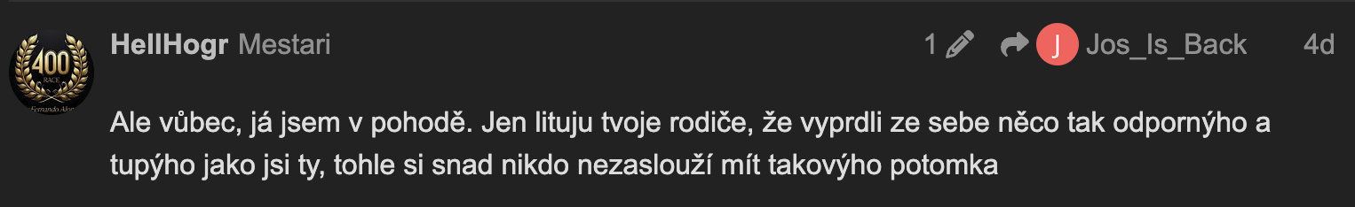 Musíš jim jen podlézat, kritika jim nevoní asi jako Verstappenovi s tím novinářem, to je naprosto obdobné…takovým lidem musíš jen podlézat aby si jim nezranil jejich ega, kritiku nesnesou, proto jsou schopni potom bagatelizovat takovýhle odpad.