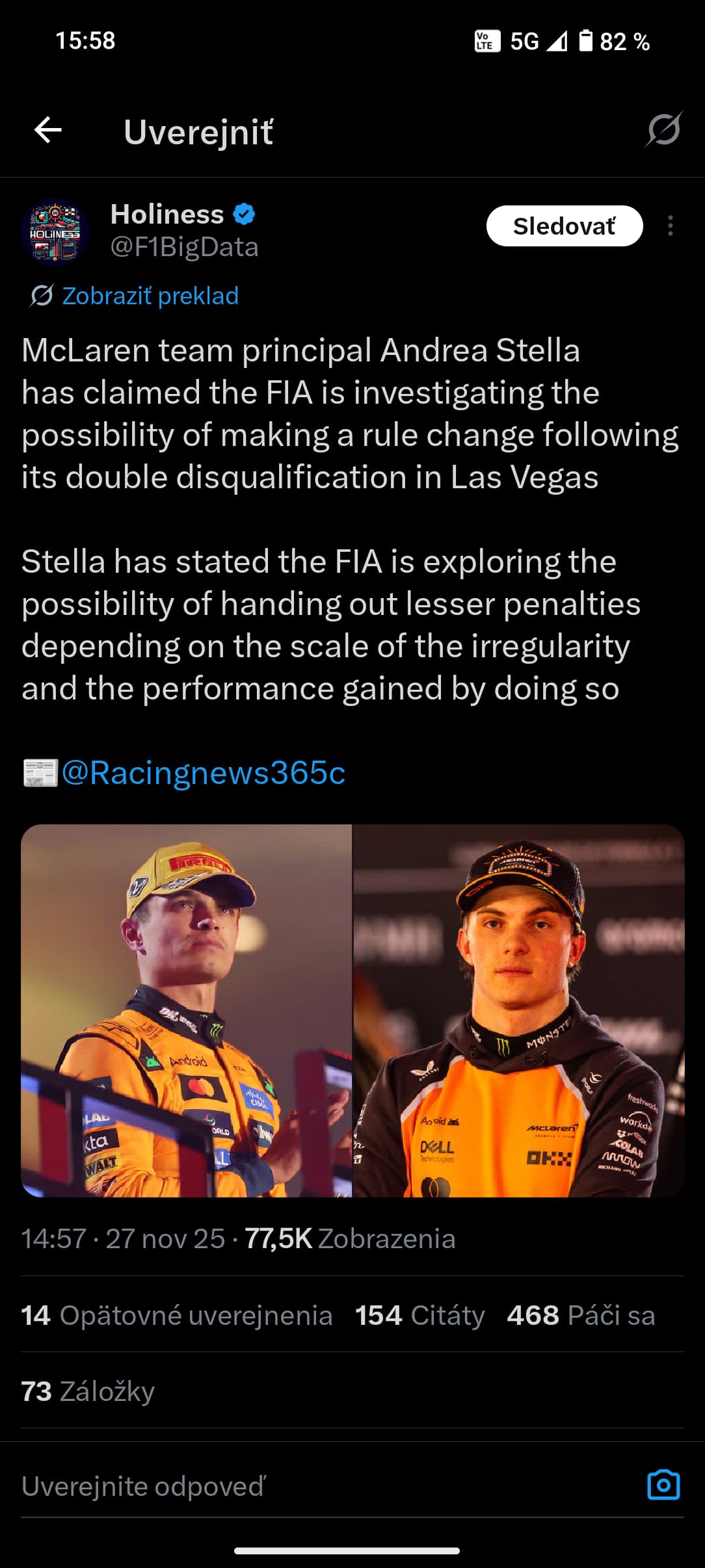 Dvojitá diskvalifikácia McLarenu prináša nečakané oživenie šampionátu v jeho samotnom závere. Existuje totiž podozrenie, že McLaren šiel so svojimi nastaveniami na hranu, pretože má obavy o svoju konkurencieschopnosť. Andrea Stella túto teóriu odmieta a porušenie pravidiel vysvetľuje okolnosťami.